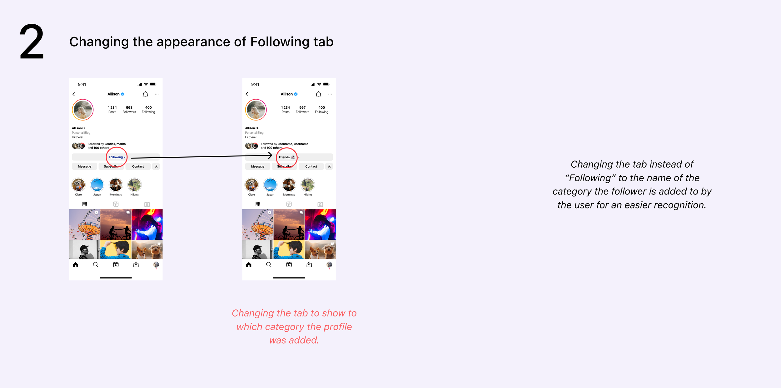 Now, we use circles to give the feature a unique style that goes well with Instagram. We also made it so that you can see a preview of three profiles. This makes it simpler for users to understand and quickly find the categories they want.