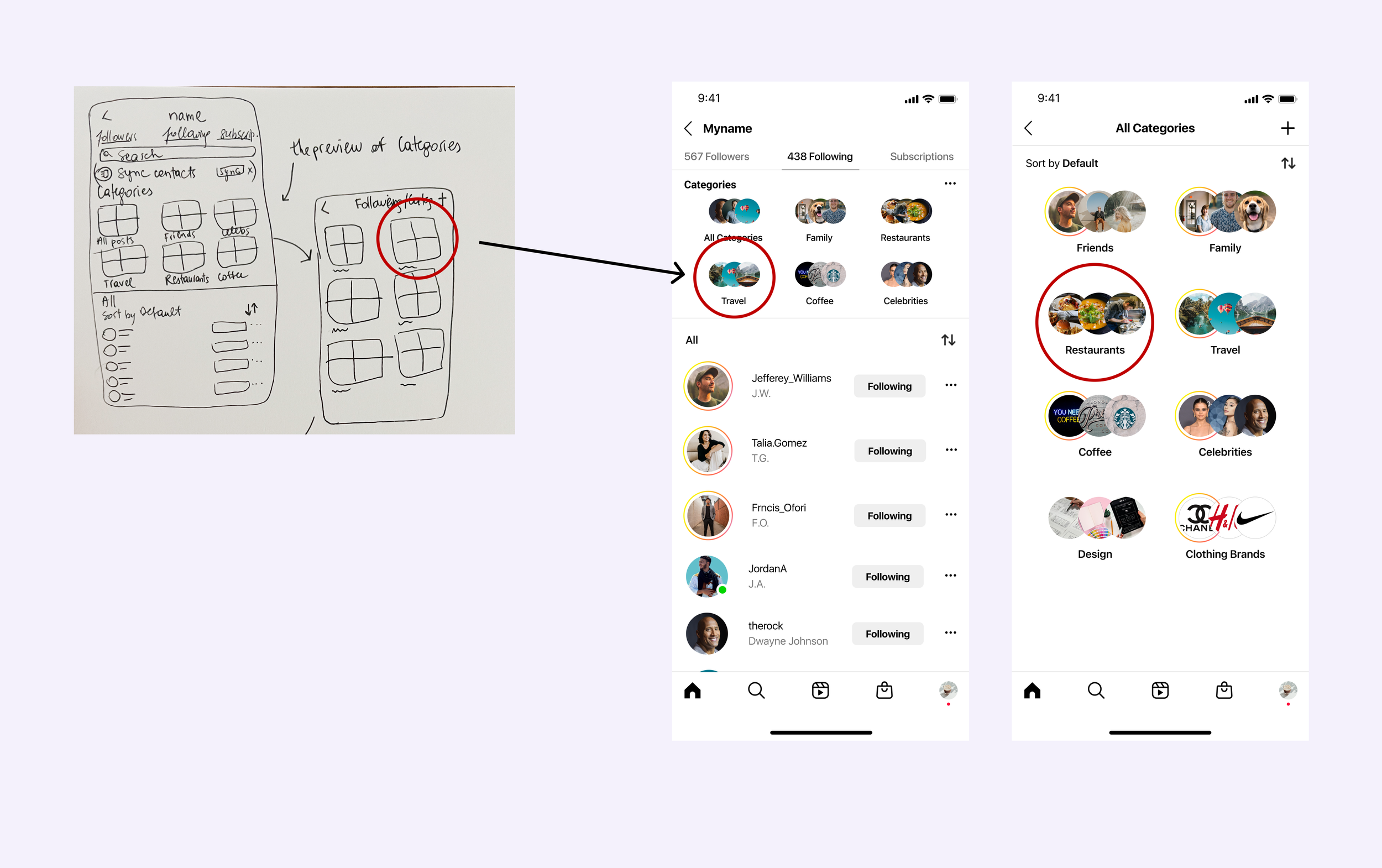 One of my key ideas was to introduce organized folders for followers, allowing users to categorize accounts—such as Food, Restaurants, Friends, and Coffee Shops. This feature will help users easily locate long-forgotten profiles and revisit beloved coffee spots without the hassle of remembering usernames.